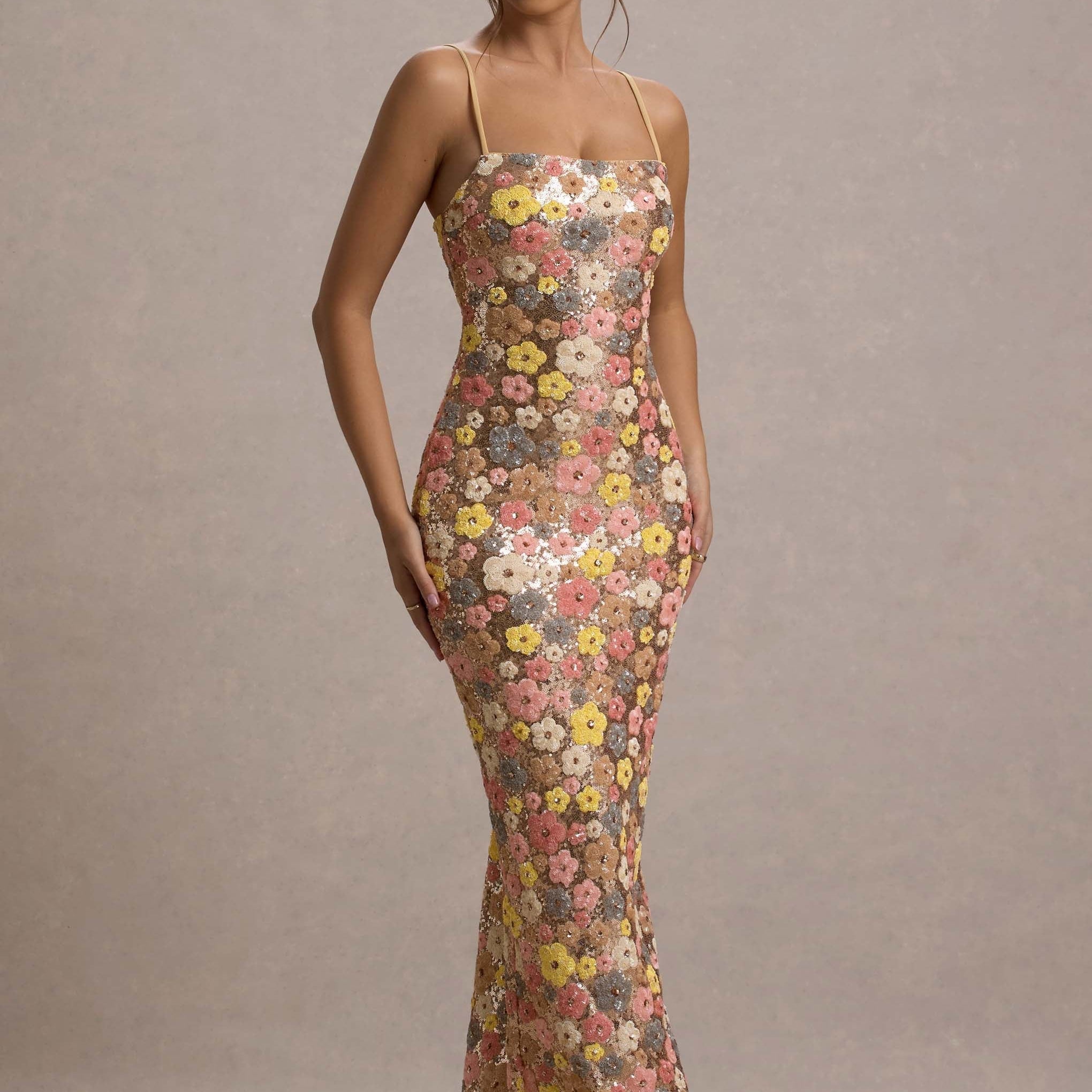 Daria – Elegantes Maxikleid mit Blumenmuster & glitzernden Pailletten