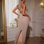 Dieses Maxikleid mit funkelnden Strasssteinen und eleganten Cut-Outs ist ideal für festliche Abende. Der figurbetonte Schnitt und der hohe Beinschlitz verleihen dem Kleid eine moderne, stilvolle Ausstrahlung.